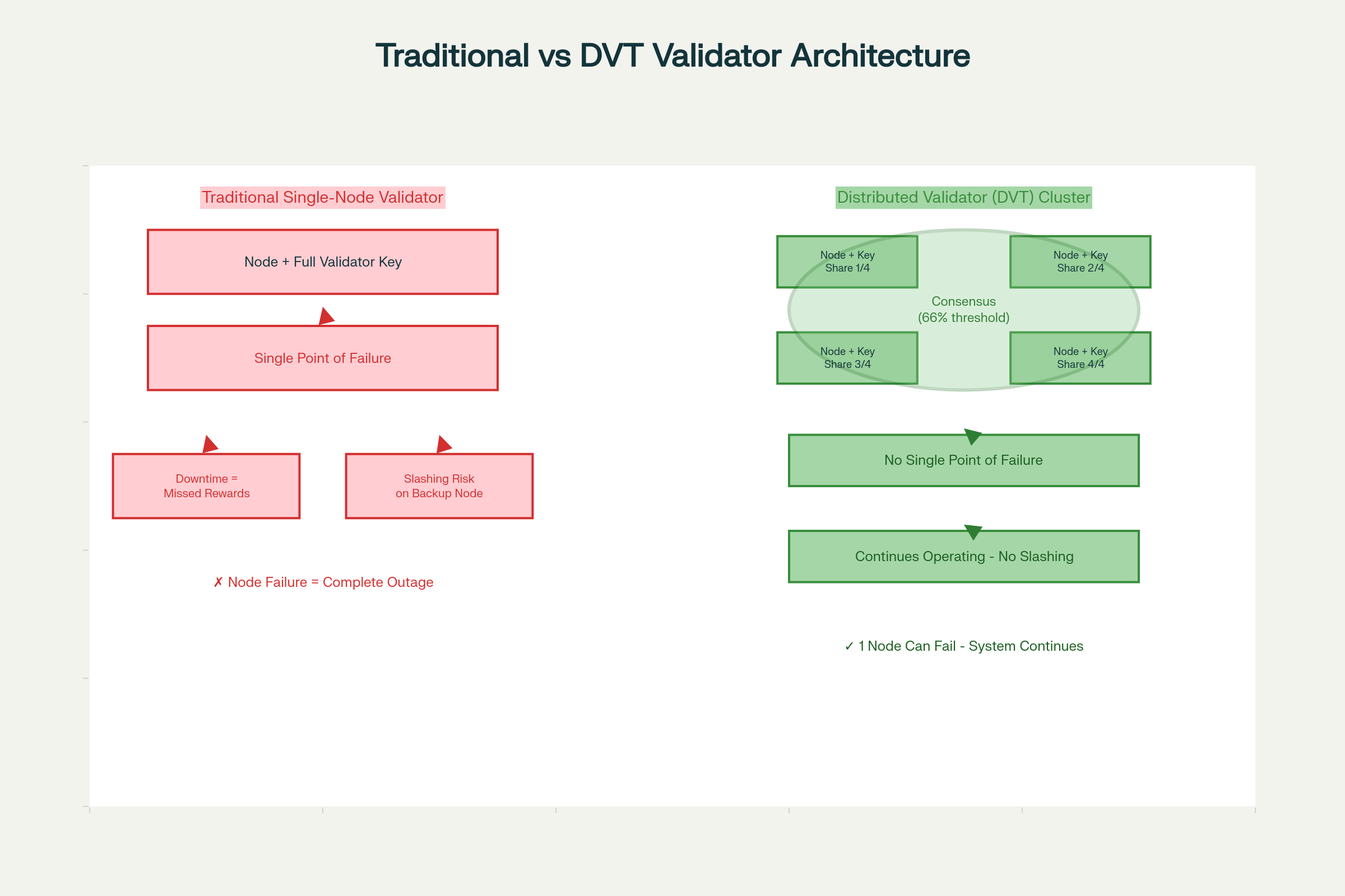 The key innovation is that a distributed validator can maintain full operational capacity even if some operators go offline, as long as the threshold of active operators is met. With a 7-out-of-10 cluster configuration, for example, the validator can continue operating normally even if 3 operators experience downtime simultaneously.