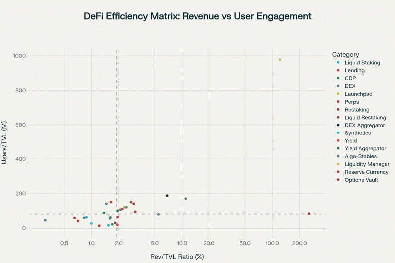 Efficiency matrix revealing which DeFi protocols achieve optimal balance between revenue generation and user engagement relative to their TVL.