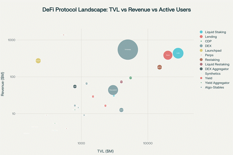 Our comprehensive bubble chart analysis reveals distinct protocol archetypes: