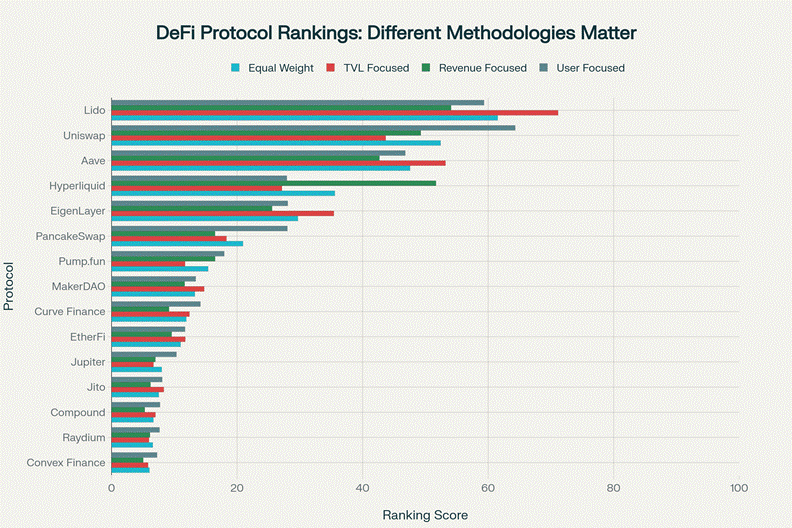 Comparative ranking chart showing how different weighting methodologies significantly impact DeFi protocol rankings, revealing the importance of metric selection in evaluation.